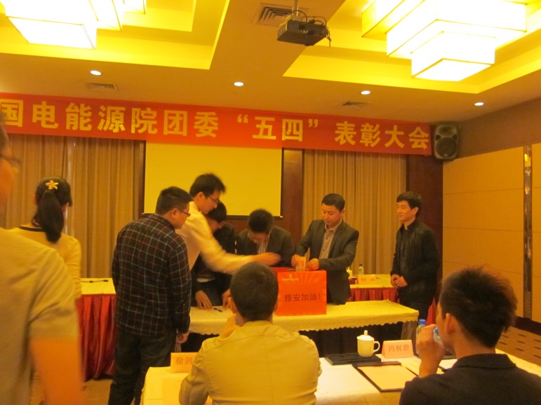 源牌集團(tuán)五四表彰總結(jié)大會在集團(tuán)公司領(lǐng)導(dǎo)的支持和集團(tuán)公司黨委的關(guān)心下于2013年4月25日在海外海賓館舉行。出席本次活動(dòng)的領(lǐng)導(dǎo)有:杭州市直機(jī)關(guān)團(tuán)工委書記蘇學(xué)卿、國電能源院黨委副書記鄭喜梅、國電能源院團(tuán)委書記付樂。表彰大會前,由主持人倡議對于4月20日8時(shí)2分在四川省雅安市蘆山縣發(fā)生7.0級地震中的遇難同胞表示哀悼,全體起立默哀三分鐘,并進(jìn)行捐款。
