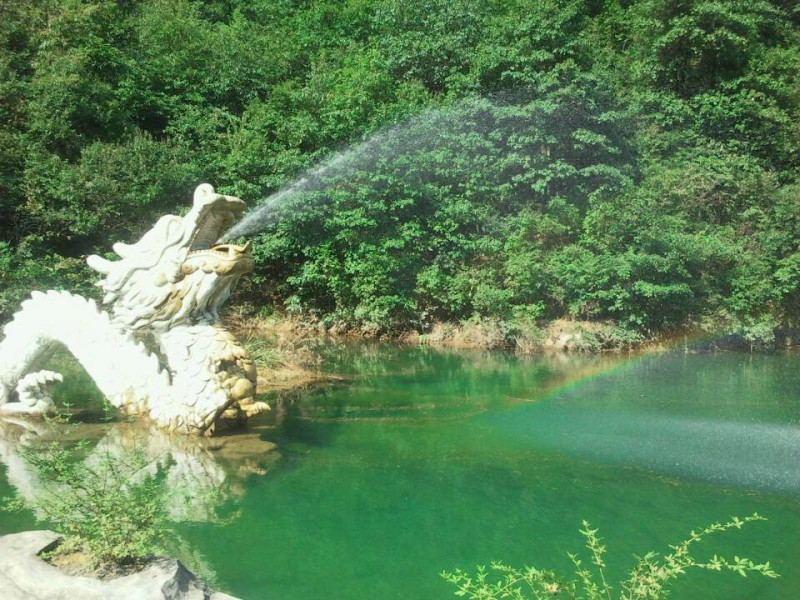 當天秋高氣爽,陽光普照,午飯后,大家背上行裝,徒步旅程開始。入門口有條白龍臥在水中,仰首吐霧向游客示意,在白龍旁邊,我們還看到了彩虹,赤橙黃綠青藍紫,我們像小孩子般的開心數著顏色,欣賞著水中泛起的陣陣漣漪……