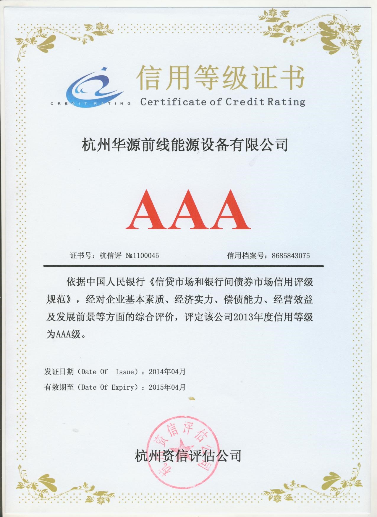 日前,杭州華源前線(xiàn)能源設(shè)備有限公司順利通過(guò)了銀行AAA級(jí)(以下簡(jiǎn)稱(chēng)3A)信用等級(jí)審核,至此,我司已連續(xù)好幾年被評(píng)為3A級(jí)信用企業(yè)。 企業(yè)銀行信用等級(jí)是銀行對(duì)企業(yè)信用資質(zhì)綜合評(píng)價(jià)的一套體系,其中3A等級(jí)為企業(yè)信用評(píng)級(jí)的最高等級(jí),只有資信優(yōu)良、資產(chǎn)質(zhì)量?jī)?yōu)良、經(jīng)濟(jì)效益高、支付能力強(qiáng)、具有良好發(fā)展前景和廣闊成長(zhǎng)空間的企業(yè)才能獲取最高等級(jí)的評(píng)定。 此次公司能夠獲取3A信用等級(jí),充分證明了專(zhuān)業(yè)金融機(jī)構(gòu)對(duì)我司的資產(chǎn)、信用和風(fēng)險(xiǎn)承擔(dān)能力的認(rèn)可,公司的社會(huì)公信力和企業(yè)實(shí)力再獲銀行肯定。 3A信用等級(jí)證書(shū)的獲取將為公司的金融業(yè)務(wù)帶來(lái)諸多便利,為投標(biāo)工作增加優(yōu)勢(shì)與可信度,它不僅象征著公司社會(huì)信譽(yù)的提升,也對(duì)公司開(kāi)拓市場(chǎng)、參與激烈的市場(chǎng)競(jìng)爭(zhēng),實(shí)現(xiàn)規(guī)模與效益同步增長(zhǎng)起到積極的促進(jìn)作用。